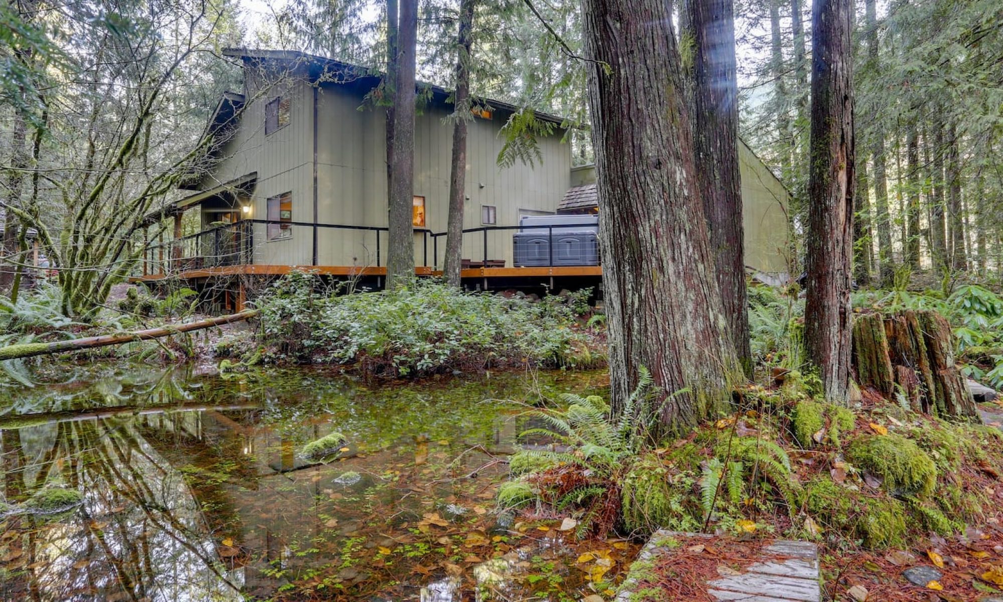 Sit in the hot tub facing a seasonal burbling brook that hosts ducks, birds, frogs, and other chirping creatures. Cozy up to the wood-fired stove while listening to LP’s on the record player. Fall asleep to the sound of the Sandy River. Sip your coffee on the deck that backs up against national forest. Set off on trails in all directions. Hop over to the community tennis court and (summer only) swimming pool. Hop a little further to multiple river and trail access points. Or just take a nap in the hammock.